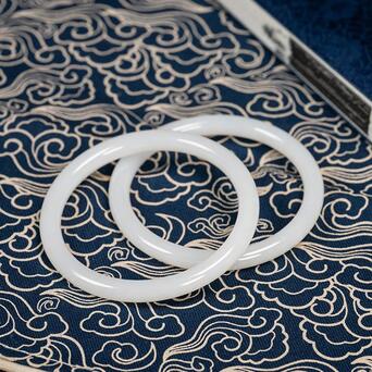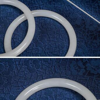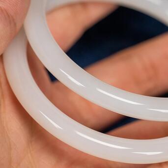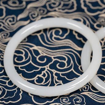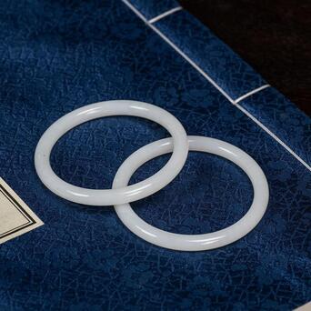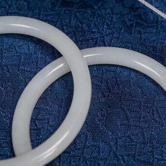 此对玉镯正是经典的贵妃镯,这种镯形态椭圆,亦称蛋镯,其相传杨贵妃十分喜爱这种形态的手镯,因为制作工艺更复杂,其又更能衬托出手腕的纤细柔美,在市场上颇受欢迎。